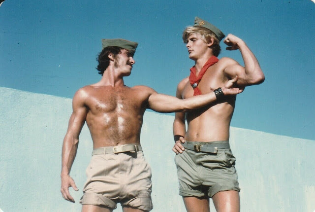 Tico Patterson (mustache) and Blue Man Hensley (bka Playgirl model James Sexton) in a couple of screenshots from their AMG film Voluptuous Scouts). This turned into a touchy-feely romp with James acting as a big tease.